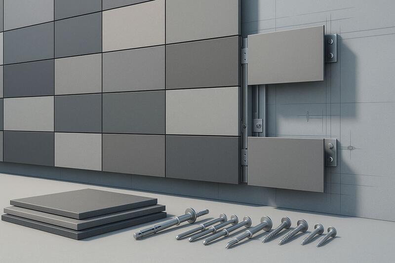 Керамогранит, HPL, фиброцемент, композитные кассеты (ACM), стальные/алюминиевые кассеты, сайдинг, натуральный камень — плотность, толщина и формат плит определяют диаметр и тип крепления, схему раскладки точек, зазоры и необходимость компенсаторов.
