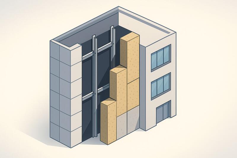 От стены к улице слои идут так: несущая стена → кронштейны → минераловатные плиты в два слоя с перекрытием швов → мембрана поверх утеплителя → вентиляционный зазор 30–60 мм → облицовка. Мембрана обращена «правильной стороной» к источнику воды — к вентзазору. При дождевом ветре капли прошивают вентиляционный зазор, но упираются в водостойкий слой. Пар из стены и утеплителя, наоборот, выходит сквозь мембрану благодаря диффузии и потоку воздуха. Поэтому так важно не перепутать сторону, выдержать нахлёст и проклейку швов.